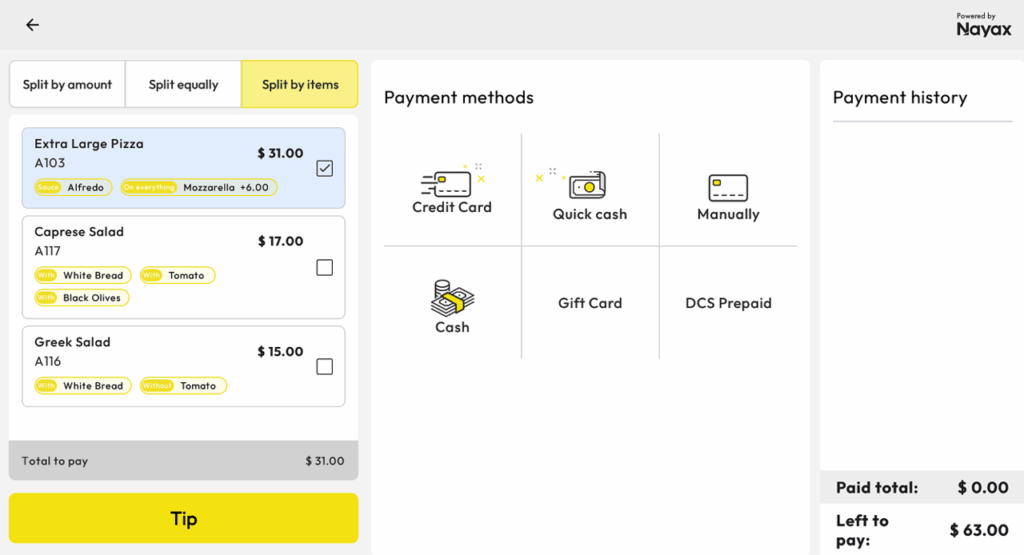 Customers now have three ways to split their bill: by amount, equally, or by specific items. The new “Split by Items” view allows line-by-line selection, automatic tip calculation, and clearer payment tracking.