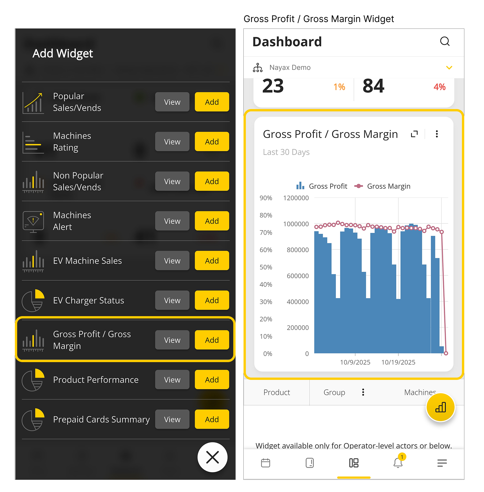 From now on, if you’re a CPO (charge point operator), you can easily make data-driven decisions based on charging connector analytics, which you can manage from the MoMa app. We’ve added two types of widgets in the Dashboard screen: (1) The new ‘EV Machine Sales’ widget displays data about revenue, energy consumed and connector charging time under the selected actor. This widget is also available on the ‘machine analytics’ screen, where you can see a display of the graph for a specific machine. (2) The second new widget is ‘EV Charger Status’, which displays the status of all connectors under the selected actor, so that you can see all your charging station status, at a glance.