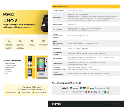 The UNO-8 reader brings the convenience of embedded payments to a wide range of applications.
